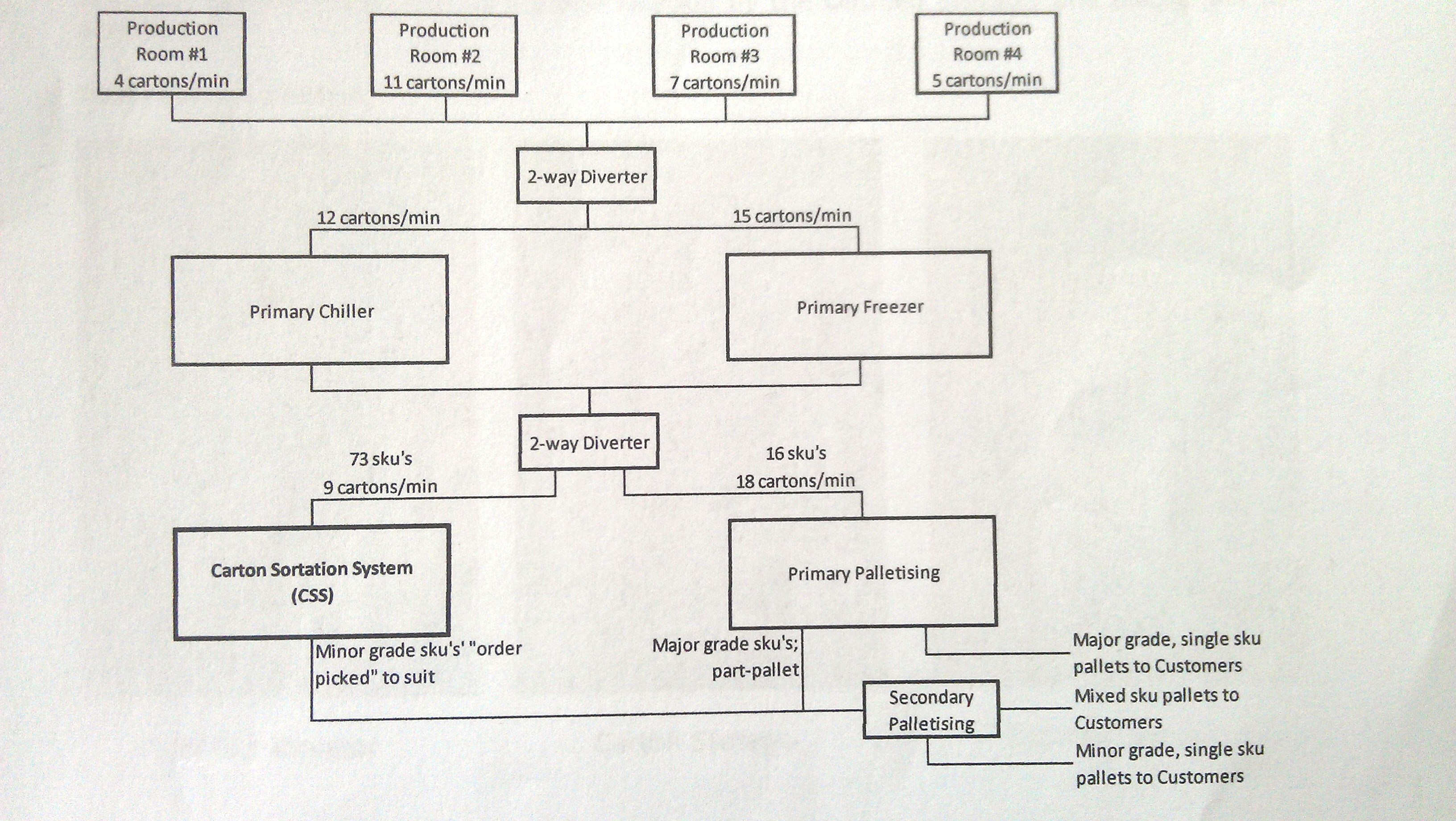 For the 73 minor-grade sku’s, the producer nominated a requirement for 120 different storage locations (12 locations wide x 10 locations high), with each location holding 12 cartons providing a total static capacity of 1,440 cartons. This suited the producer’s particular needs as they expected the maximum time that any carton would be required to be stored before being palletised to be 160 minutes (on average).
